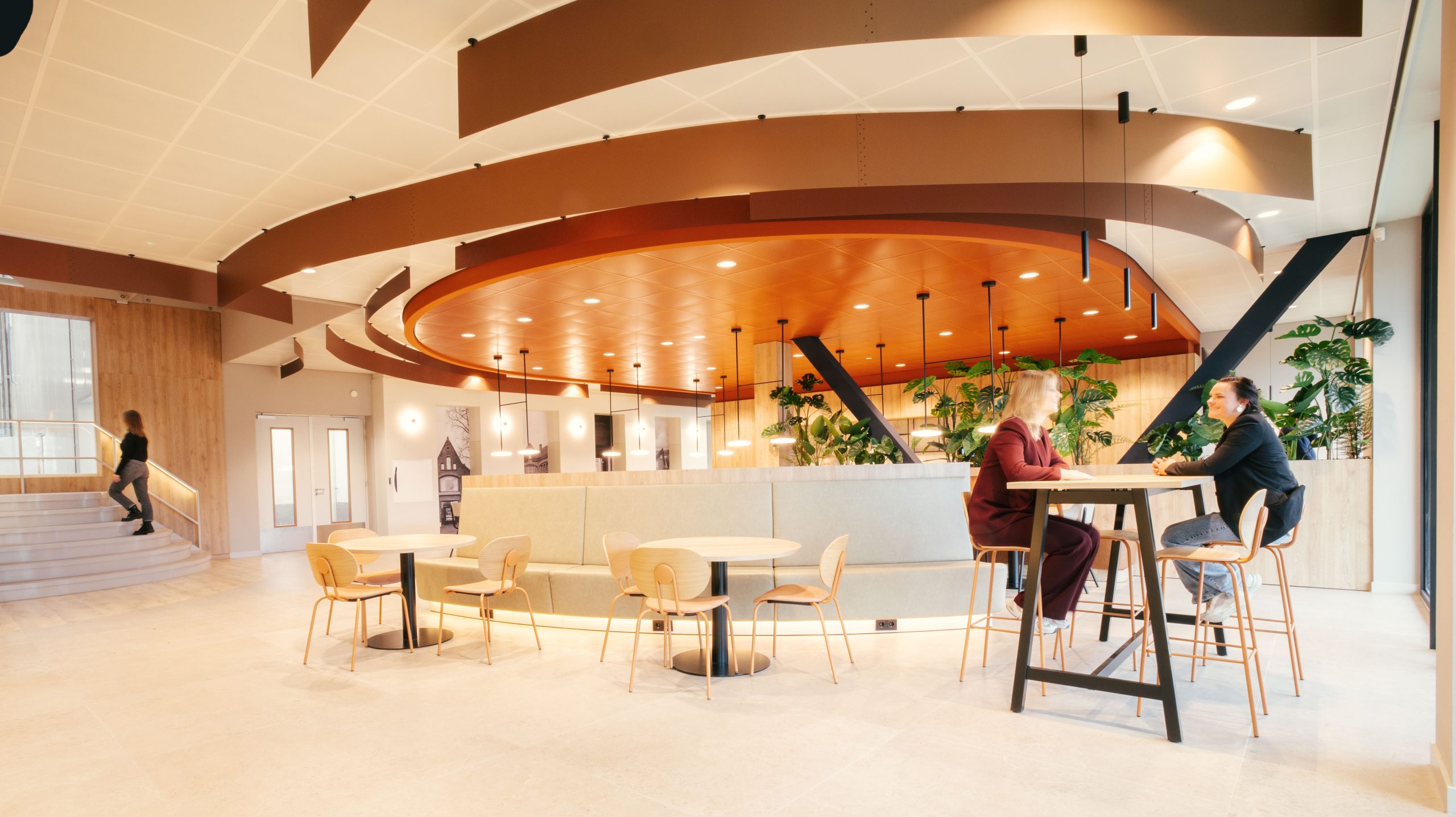 Geurtsen’s craftsmanship is subtly woven into the design. Three interlocking gears form the basis of the concept and can be seen in the staircase, the café and the reception desk, among other places. These shapes are also reflected in the rounded lines of the spaces and in the ceiling lines, which ensure logical routing through the working environment.